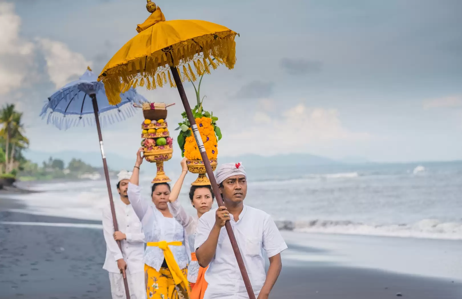 A few days before Nyepi, Balinese Hindus perform the Melasti ceremony. This purification ritual usually takes place near the ocean. In southern Bali, including areas near Uluwatu, you may see long processions of locals dressed in traditional white clothing. They carry sacred temple objects to the sea for spiritual cleansing. It is a beautiful and respectful ceremony to witness.